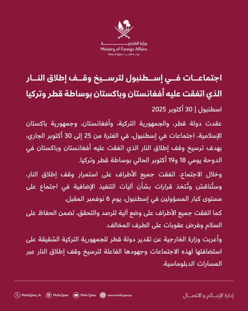 د قطر د بهرنيو چارو وزارت د پاکستان او افغانستان د مذاکراتو برياليتوب تاييد کړې دې، د قطر د بهرنيو چارو وزارت د پاکستان او افغانستان ترمنځ په استنبول کې ترسره شوو مذاکراتو په بريالیتوب سره پای ته رسېدو تصديق کړی او په دې اړه یې رسمي بيان خپور کړی دی