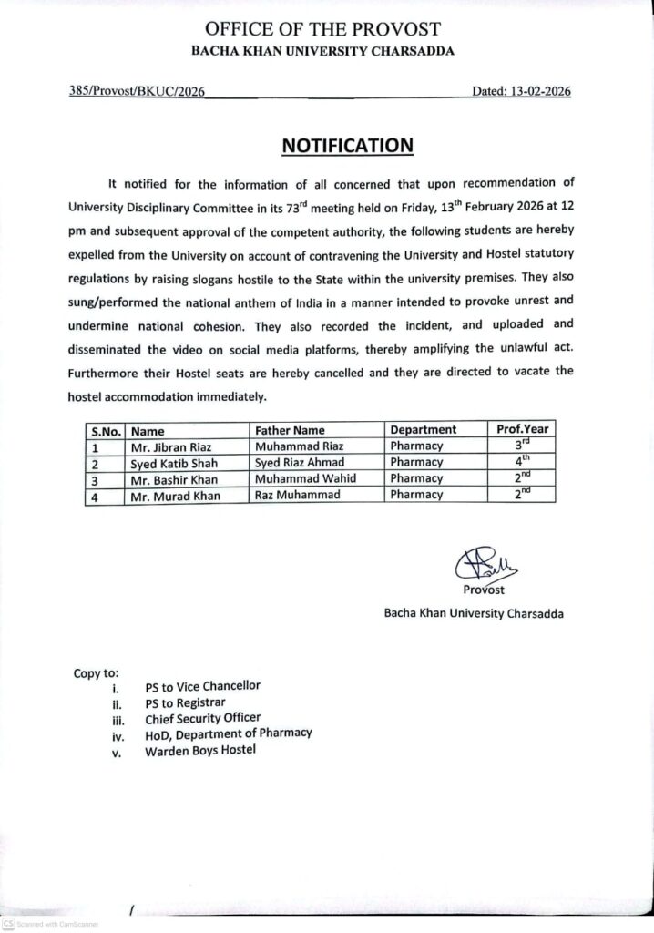 د خیبر پښتونخوا د باچا خان پوهنتون په فارمسۍ څانګه کې د هندوستان ملي سرود ویلو او شعارونو وهلو په تور څلور زده کوونکي سمدستي له پوهنتون څخه ایستل شوي دي. دا پرېکړه د پوهنتون د انضباطي کمېټۍ په ۷۳ مې غونډه کې شوې، چې د پېښې د جديت په نظر کې نیولو سره یې د سختو تادیبي اقدامونو سپارښتنه کړې وه.