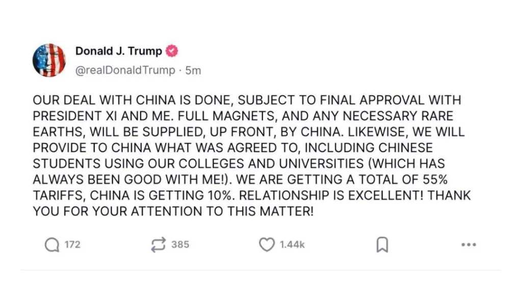 ټرمپ په خپل Truth Social پیغام کې ویلي چې د سفر تیاریانې روانې دي او تمه لري چې له چینایي ولسمشر شي جینپینګ سره مهمې خبرې وشي. هغه همدارنګه زیاته کړې چې پلان لري شي جینپینګ سږ کال واشنګټن ته هم بلنه ورکړي